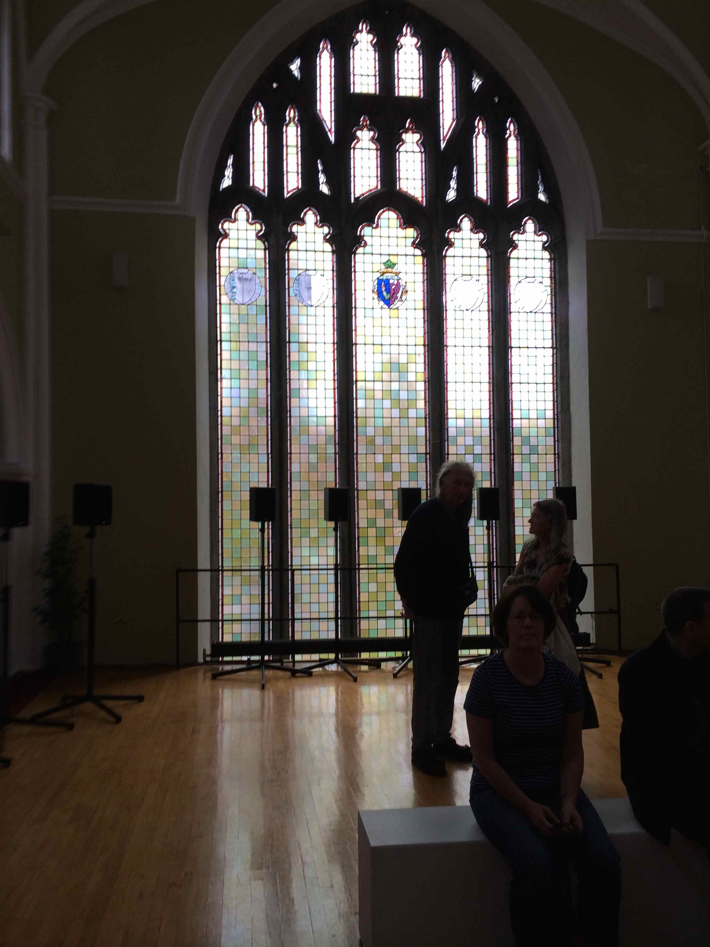 It seems like there is always one work that makes any effort at seeing art worthwhile. In this case, of the five galleries I visited between two evenings of theatre, Janet Cardiff’s The Forty Part Motet was it. Originally presented in 2001, this is a sound installation based on the English composer Thomas Tallis’s masterwork, No Other is My Hope. The installation was presented in the very church-like setting of National University of Ireland Galway’s lovely Aula Maxima, a large empty public room with soaring ceilings and an arched stained-glass window. The installation is forty speakers ranged in an oval, with various parts of the music coming through a constantly shifting configuration of the sound. As the eleven-minute work ebbs and flows, visitors are encouraged to walk around in order to capture both the full power and the individual pieces of the work. During the three-minute interval between the looped presentations, many people in the gallery talked, or left. But, hearing some ambient noise in the room, I went very close to the speakers; the artist had captured the sounds of a performance intermission, with rustling of programs, disjointed bits of conversation and musicians warming up their voices. It felt like a secret gift from the artist to those who were paying particular attention. I could have stayed all day.
